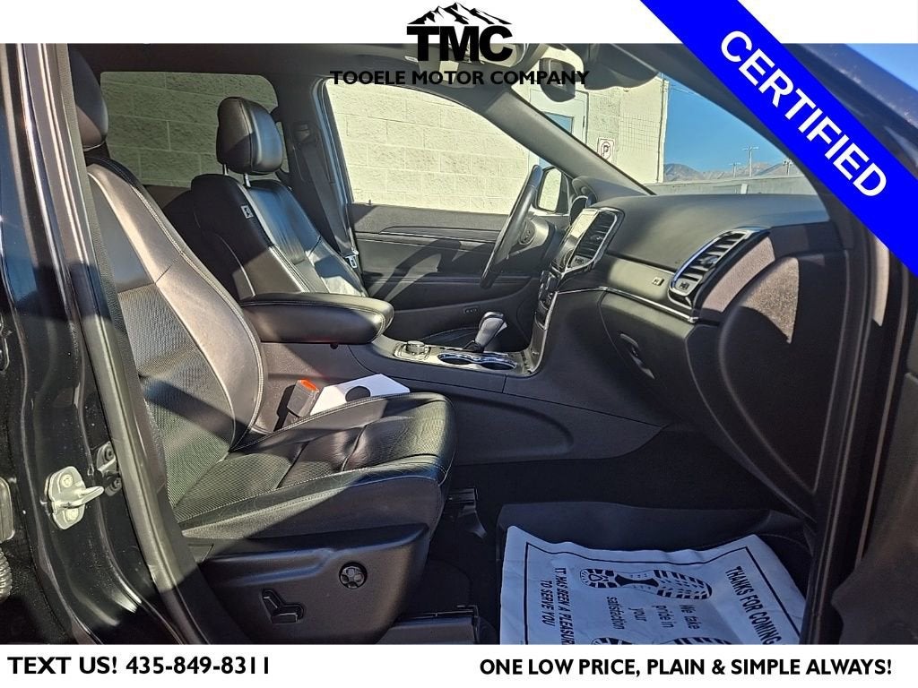 Certified. 2021 Jeep Grand Cherokee 80th Anniversary Edition + Parallel & Perpendicular Parking Assist Odometer is 5191 miles below market average! Priced below KBB Fair Purchase Price! Ford Blue Advantage: Blue Certified Certified, 4WD, 4G LTE Wi-Fi Hot Spot, 8.4 Touchscreen Display, Adaptive Cruise Control w/Stop, Advanced Brake Assist, Apple CarPlay/Android Auto, Front dual zone A/C, Full Speed FWD Collision Warn Plus, GPS Navigation, Heated front seats, Integrated Voice Command w/Bluetooth®, Lane Departure Warning Plus, Leather Trimmed Bucket Seats (JY), Memory seat, Navigation System, Parallel & Perp Park Assist w/Stop, ParkView Rear Back-Up Camera, Power driver seat, Power Liftgate, Power moonroof, Quick Order Package 2BK 80th, Radio: Uconnect 4C Nav w/8.4 Display, Rain Sensitive Windshield Wipers, Rear Accent/Body Color Fascia, SiriusXM Satellite Radio, Steering wheel mounted audio controls, Wheels: 20 x 8.0 Granite Crystal Aluminum, 230MM Rear Axle, 3.45 Rear Axle Ratio, 4-Wheel Disc Brakes, 6 Speakers, ABS brakes, Air Conditioning, Alloy wheels, AM/FM radio: SiriusXM, Anti-whiplash front head restraints, Apple CarPlay, Audio memory, Auto-dimming door mirrors, Auto-dimming Rear-View mirror, Automatic temperature control, Berber Floor Mats w/80th Anniversary Tag, Black Roof Molding, Body Color Claddings, Body Color Door Handles, Body Color Shark Fin Antenna, Brake assist, Bumpers: body-color, Compass, Dark Day Light Opening Moldings, Dark Headlamp Bezel Finish, Dark Lens Taillamps, Delay-off headlights, Driver door bin, Driver vanity mirror, Dual front impact airbags, Dual front side impact airbags, Electronic Stability Control, Emergency communication system: SiriusXM Guardian, Four wheel independent suspension, Front Accent/Body Color Fascia, Front anti-roll bar, Front Bucket Seats, Front Center Armrest w/Storage, Front fog lights, Front reading lights, Fully automatic headlights, Garage door transmitter, Google Android Auto, GPS Antenna Input, Granite Crystal Exterior Accents, Granite Crystal Exterior Badging, Granite Crystal Exterior Mirror Caps, Granite Crystal/Black Grille, HD Radio, Heated door mirrors, Heated steering wheel, Illuminated entry, Jeep 80th Anniversary Badges, Jeep 80th Anniversary Edition, Knee airbag, Leather Shift Knob, Leather Trimmed Bucket Seats, Low tire pressure warning, LT. Tungsten Interior Accent Stitching, Normal Duty Suspension, Occupant sensing airbag, Outside temperature display, Overhead airbag, Overhead console, Panic alarm, Passenger door bin, Passenger vanity mirror, Piano Black/Anod. Gunmetal Interior Accents, Power door mirrors, Power passenger seat, Power steering, Power windows, Radio data system, Rear anti-roll bar, Rear reading lights, Rear seat center armrest, Rear window defroster, Rear window wiper, Remote keyless entry, Roof rack: rails only, Security system, SiriusXM Traffic Plus, SiriusXM Travel Link, Speed control, Speed-sensing steering, Speed-Sensitive Wipers, Split folding rear seat, Spoiler, Tachometer, Telescoping steering wheel, Tilt steering wheel, Traction control, Trip computer, Turn signal indicator mirrors, Variably intermittent wipers, Voltmeter, Wheels: 18 x 8.0 Tech Gray Diamond Cut, 4WD, 4G LTE Wi-Fi Hot Spot, 8.4 Touchscreen Display, Adaptive Cruise Control w/Stop, Advanced Brake Assist, Apple CarPlay/Android Auto, Front dual zone A/C, Full Speed FWD Collision Warn Plus, GPS Navigation, Heated front seats, Integrated Voice Command w/Bluetooth®, Lane Departure Warning Plus, Leather Trimmed Bucket Seats (JY), Memory seat, Navigation System, Parallel & Perp Park Assist w/Stop, ParkView Rear Back-Up Camera, Power driver seat, Power Liftgate, Power moonroof, Quick Order Package 2BK 80th, Radio: Uconnect 4C Nav w/8.4 Display, Rain Sensitive Windshield Wipers, Rear Accent/Body Color Fascia, SiriusXM Satellite Radio, Steering wheel mounted audio controls, Wheels: 20 x 8.0 Granite Crystal Aluminum.Certification Program Details: Ford Blue Advanta