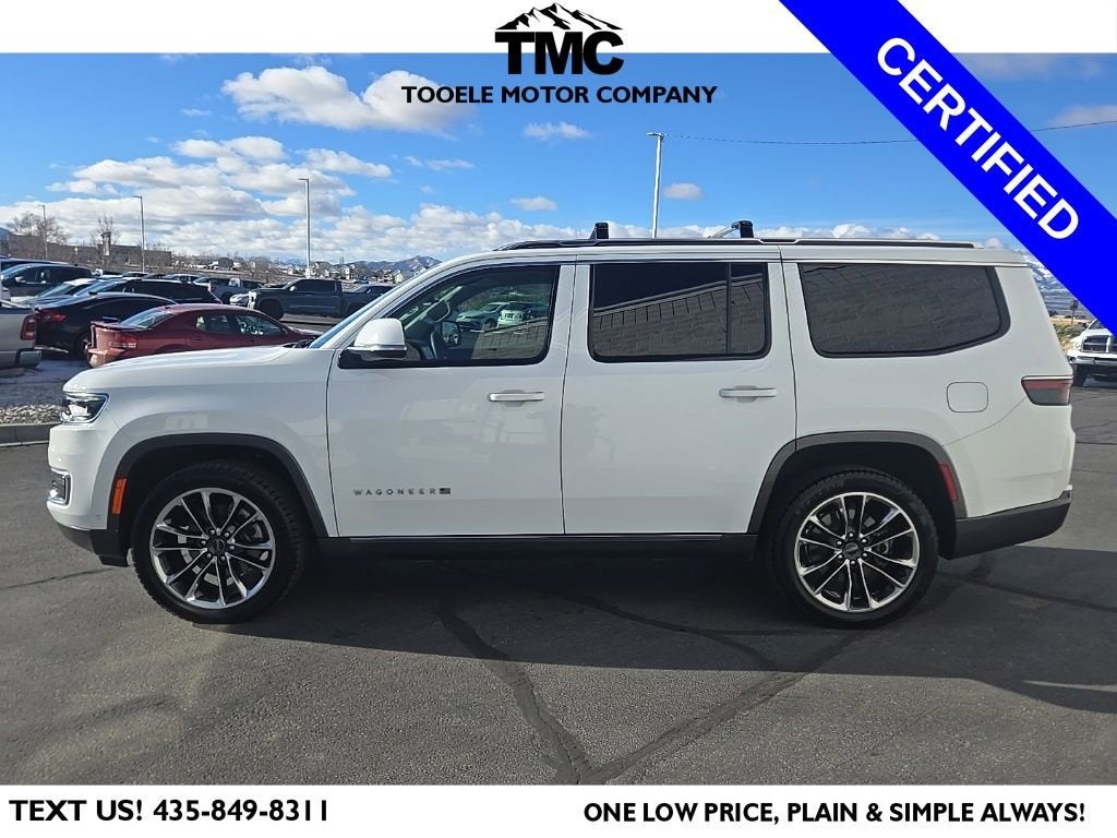 Certified. 2022 Jeep Wagoneer Series III + 3 Panel Moonroof + Heated Front & Rear Seats Odometer is 8164 miles below market average! Priced below KBB Fair Purchase Price! Ford Blue Advantage: Blue Certified Certified, 10 Speakers, 19 Speaker McIntosh Audio System, 3 Panel Sunroof, 3.21 Rear Axle Ratio, 3rd row seats: bench, 4-Wheel Disc Brakes, 7-Passenger Seating, ABS brakes, Adjustable pedals, Adjustable Roof Rail Crossbars, Air Conditioning, All-Season Floor Mats, Alloy wheels, AM/FM radio: SiriusXM with 360L, Anti-whiplash front head restraints, Audio memory, Auto High-beam Headlights, Auto-dimming door mirrors, Auto-dimming Rear-View mirror, Auto-leveling suspension, Automatic temperature control, Brake assist, Bumpers: body-color, Cargo Cover, Cargo Tray, Compass, Delay-off headlights, Driver door bin, Driver vanity mirror, Driver's Seat Mounted Armrest, Dual front impact airbags, Dual front side impact airbags, Electronic Stability Control, Exterior Parking Camera Rear, Flexible Seating Group, Floor Console w/Cupholder, Four wheel independent suspension, Front anti-roll bar, Front Bucket Seats, Front Center Armrest w/Storage, Front dual zone A/C, Front fog lights, Front Passenger Interactive Display, Front reading lights, Fully automatic headlights, Garage door transmitter, Genuine wood console insert, Genuine wood dashboard insert, Genuine wood door panel insert, Heads-Up Display, Heated door mirrors, Heated front seats, Heated rear seats, Heated steering wheel, Illuminated entry, Knee airbag, Leather Trimmed Bucket Seats, Low tire pressure warning, Luxury Front & Rear Floor Mats, Memory seat, MOPAR Interior Protection Package, Navigation System, Normal Duty Suspension, Occupant sensing airbag, Outside temperature display, Overhead airbag, Overhead console, Panic alarm, Passenger door bin, Passenger seat mounted armrest, Passenger vanity mirror, Pedal memory, Power adjustable front head restraints, Power Deployable Running Boards, Power door mirrors, Power driver seat, Power Liftgate, Power passenger seat, Power steering, Power Tip/Slide Recline 2nd Row Buckets, Power windows, Premium Group I (DISC), Quick Order Package 22N, Radio data system, Radio: Uconnect 5 Nav w/10.1 Display, Rain sensing wipers, Rear air conditioning, Rear anti-roll bar, Rear dual zone A/C, Rear reading lights, Rear seat center armrest, Rear window defroster, Rear window wiper, Reclining 3rd row seat, Remote keyless entry, Reversible Carpet/Vinyl Cargo Mat, Security system, Speed control, Speed-sensing steering, Speed-Sensitive Wipers, Split folding rear seat, Steering wheel memory, Steering wheel mounted audio controls, Tachometer, Telescoping steering wheel, Tilt steering wheel, Traction control, Trip computer, Turn signal indicator mirrors, Variably intermittent wipers, Ventilated front seats, Voltmeter, Wheels: 20 x 9.0 Premium 2 Aluminum, Wheels: 22 x 9.0 Premium 3 Aluminum (DISC).