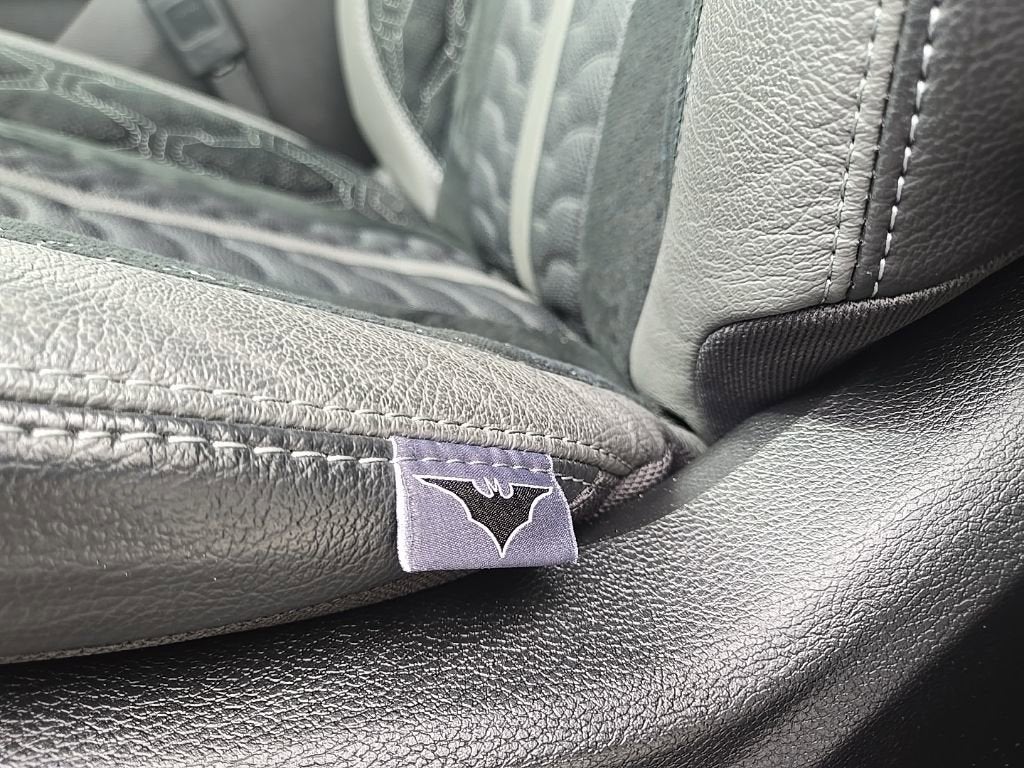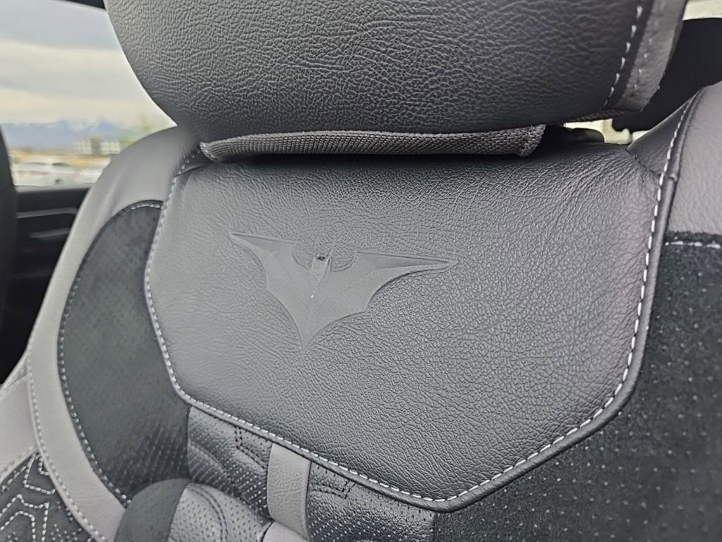 The front and rear seats are custom upholstered to resemble the sharp-style of the superhero's iconic armored bat suit. It's zipped up in a soft black cloth and smooth grey and black leather with the RAM lettering being swapped for an embossed Bat logo.